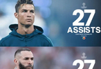 這是皇馬在歐冠歷史上助攻最多的三位球員,C羅和本澤馬都收獲了27次助攻。而維尼修斯反超他們也指日可待了。
