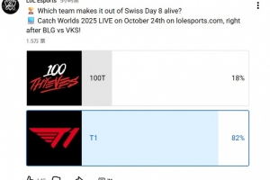 LoL Esports官方發(fā)布本場比賽的賽果預(yù)測投票,82%的投票者認為T1將獲勝。