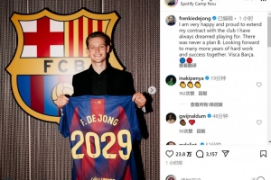 體育資訊10月16日訊 巴薩官方宣布,隊(duì)內(nèi)中場(chǎng)德容續(xù)約至2029年,德容社媒發(fā)文慶祝。