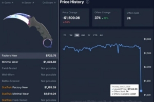 比如先前市場上較貴的武器飾品之一爪刀多普勒(Karambit Doppler),據CSGOSKINS平臺顯示,其價格從2700多美元驟跌到了1100多美元。