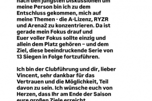 經(jīng)過近期關(guān)于我個人的討論后,我已決定將精力專注于當前事務(wù)——A級教練證書課程、RYZR項目以及Arena2計劃。這些是我現(xiàn)階段的重心,而你們的全部注意力應(yīng)當集中在賽場——以及延續(xù)當前13場連勝的卓越戰(zhàn)績。