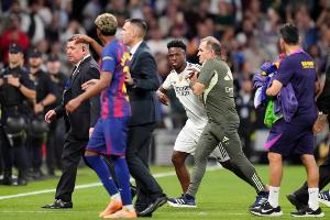 體育資訊10月27日訊 西班牙國家德比皇馬2-1擊敗巴薩,TA發(fā)文梳理本場比賽最后階段的一系列亂象,由于球員情緒失控,警察出面干預(yù)才將球員分開。