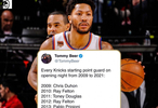 直播吧10月28日訊 美媒BetMgm列出了一項有關(guān)尼克斯的數(shù)據(jù),在布倫森22-23賽季代表球隊出戰(zhàn)之前的13個賽季(2009-2021),球隊共在賽季揭幕戰(zhàn)中使用了12位球員作為先發(fā)控衛(wèi)。