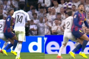 弗里克的球隊(duì)整場(chǎng)控球占優(yōu),但踢法很容易預(yù)測(cè)、缺乏銳度。只有費(fèi)爾明和拉什福德偶爾能突破皇馬防線。佩德里被重點(diǎn)盯防,亞馬爾無法正面拿球,費(fèi)蘭觸球機(jī)會(huì)少且很難獲得舒服的射門位置,全場(chǎng)僅兩次向庫爾圖瓦射門。上半場(chǎng)最佳進(jìn)攻是費(fèi)爾明的進(jìn)球,佩德里斷球后迅速轉(zhuǎn)化為絕對(duì)機(jī)會(huì)。稍后,費(fèi)爾明頭球攻門,又被赫伊森在門線救險(xiǎn)。