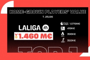 另一方面,這并未對(duì)人才保留產(chǎn)生負(fù)面影響。除了西甲本土球員的經(jīng)濟(jì)價(jià)值外,它還是給予青訓(xùn)營(yíng)球員最多機(jī)會(huì)的聯(lián)賽,在2024/25賽季,本土球員出場(chǎng)時(shí)間占比為19.8%,而法甲為13.5%、德甲為7%、英超為6.4%、意甲為5.5%。這些數(shù)據(jù)鞏固了西班牙足球作為最佳整合本土人才的環(huán)境的地位,結(jié)合了競(jìng)技表現(xiàn)和經(jīng)濟(jì)可持續(xù)性。