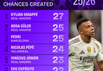 北京時(shí)間10月29日,知名數(shù)據(jù)平臺(tái)Squawka列出了本賽季西甲聯(lián)賽中創(chuàng)造機(jī)會(huì)最多的球員榜單,皇馬球星姆巴佩27次領(lǐng)跑榜單,居萊爾、佩德里25次緊隨其后。