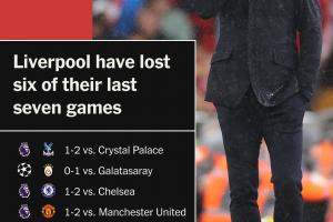 利物浦各項賽事近7場6敗,聯(lián)賽杯出局、止步16強,英超落后榜首7分。上賽季的耐考王如今節(jié)節(jié)退敗。