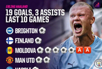 此外,在過去的10場俱樂部+國家隊比賽中,哈蘭德狀態(tài)火熱,貢獻19球3助。