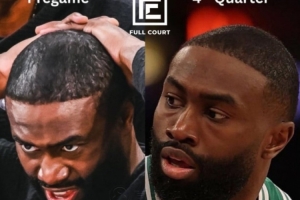 據(jù)此前報(bào)道,綠軍球星杰倫-布朗遭遇了“發(fā)際線(xiàn)危機(jī)”,本賽季至今已經(jīng)多次將自己的發(fā)際線(xiàn)粉蹭到對(duì)手球衣上。