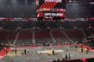 賽前,開拓者跟隊(duì)中文記者Victor Sun分享開拓者主場地板,并寫道:“NBA杯遇上萬圣節(jié)?!?/p>