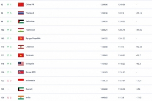 體育資訊10月17日訊 IFA更新最新一期國家隊(duì)排名,亞足聯(lián)國家隊(duì)方面,國足積分不變,但排名從世界第94位升至世界第93位,亞洲排名則仍是第14位。