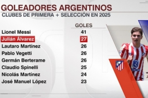 進(jìn)入2025年,阿爾瓦雷斯在俱樂部和國家隊(duì)已打進(jìn)27球,阿根廷球員中僅次于梅西的41球。在阿爾瓦雷斯身后是勞塔羅(26球)、維格蒂(26球)、貝爾泰拉梅(26球)、斯皮內(nèi)利(25球)、尼古拉斯-馬丁內(nèi)斯(24球)以及何塞-洛佩斯(23球)。