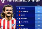 梅西和C羅分別打進(jìn)474球和311球排名一二。本輪替補(bǔ)出戰(zhàn)的格里茲曼打入一球,成為西甲歷史上第11位達(dá)到這一成就的球員。