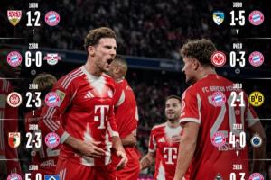 體育資訊11月02日訊 德甲第9輪,拜仁3-0大勝勒沃庫(kù)森,新賽季15連勝,一共攻入54球。