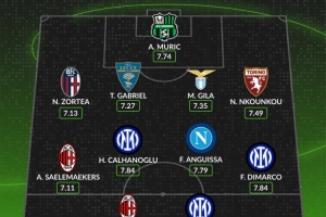 中場:薩勒馬科爾斯(米蘭)、恰爾汗奧盧(國米)、安古伊薩(那不勒斯)、迪馬爾科(國米)