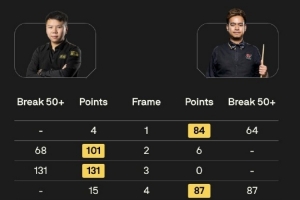 本場(chǎng)比賽,周躍龍轟出兩桿破百和兩桿50+,桑卡姆打出五桿50+。雙方前八局比賽打成4-4平,最后??愤B勝兩局拿下比賽勝利。