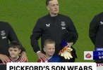 【真心】#桑德蘭1比1埃弗頓#,埃弗頓門將皮克福德帶著他的球童兒子入場,他的兒子穿著桑德蘭+埃弗頓的拼接球衣。