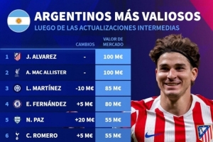 體育資訊10月18日訊 德國(guó)轉(zhuǎn)會(huì)市場(chǎng)更新了部分球員的身兼,并列出阿根廷球員德轉(zhuǎn)身價(jià)排名,阿爾瓦雷斯、麥卡利斯特1億歐居首。