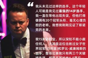 墨菲:我從未見過這樣的選手。這個年輕人可能是我見過最強的14歲選手。我一直在等他出現(xiàn)失誤,但他打得像擁有20個冠軍頭銜、毫無心理負擔的老將。我想我剛剛見證了斯諾克的未來。
