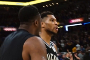 完成絕殺后,字母哥面對客場球迷連續(xù)做出拇指向下動作,字母哥哥趕緊上前制止,并用希臘語喊著“冷靜冷靜”。