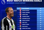 德轉(zhuǎn)公布了英超歷史“制勝進(jìn)球榜”,統(tǒng)計了英超球員英超生涯中直接決定比賽勝負(fù)的進(jìn)球數(shù)量。