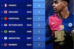 體育資訊11月5日訊 巴黎圣日耳曼小將杜埃贏得了2025年金童獎(jiǎng),德轉(zhuǎn)盤點(diǎn)了各國(guó)球員贏得金童獎(jiǎng)次數(shù),西班牙以5次居首。