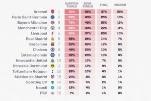 歐冠奪冠概率:阿森納超22%獨一檔,巴黎拜仁曼城利物浦皇馬2-6位