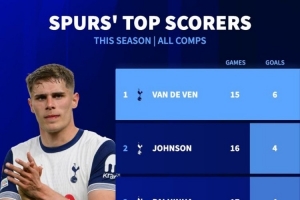 德國轉(zhuǎn)會市場統(tǒng)計了本賽季熱刺隊內(nèi)球員的進(jìn)球數(shù)量,并列出榜單,中衛(wèi)范德芬6球居首。