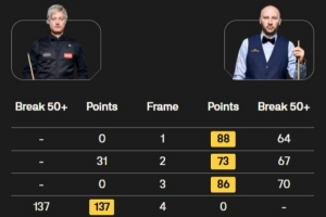 開場舒爾第連下三局,羅伯遜打出137分扳回一城,休息歸來舒爾第連續(xù)打出單桿制勝以5-1取得賽點(diǎn),隨后羅伯遜連追兩個賽點(diǎn),第九局舒爾第打出單桿78分制勝。