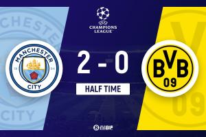 上半場(chǎng)補(bǔ)時(shí)2分鐘。半場(chǎng)戰(zhàn)罷,曼城2-0多特。