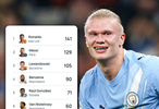 25歲哈蘭德52場歐冠轟入54球,目前排在歐冠歷史射手榜第10。距離第9的穆勒差3球。