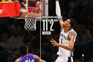 不過(guò)在比賽中,他仍有十佳球表現(xiàn)。NBA官方發(fā)布了他隔扣布朗尼一球的兩項(xiàng)數(shù)據(jù),其中球的最高點(diǎn)達(dá)到了3.4米,而文班亞馬這一扣的滑行距離達(dá)到2.2米。