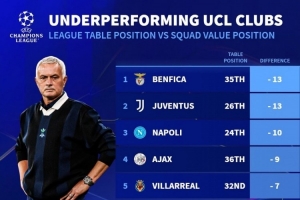 體育資訊11月6日訊 德國轉(zhuǎn)會(huì)市場根據(jù)球隊(duì)目前歐冠排名與陣容身價(jià)排名的差距,列出了本賽季歐冠表現(xiàn)不佳球隊(duì)榜,本菲卡、尤文最差。
