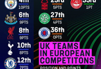 英格蘭俱樂部三級(jí)歐戰(zhàn)聯(lián)賽階段排名↓(歐冠、歐聯(lián)4輪;歐協(xié)聯(lián)3輪)
