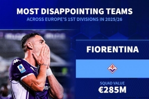 體育資訊11月7日訊 德國轉會市場根據(jù)球隊的身價和目前的排名,列出了本賽季歐洲頂級聯(lián)賽最令人失望球隊,佛羅倫薩、紐卡、畢爾巴鄂競技在列。