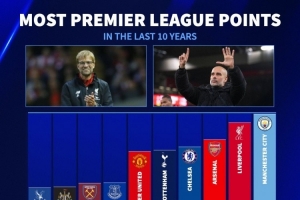 體育資訊11月9日訊 德國轉(zhuǎn)會(huì)市場統(tǒng)并列出近10年英超球隊(duì)總積分排名,曼城847分居首,利物浦、阿森納二三位。