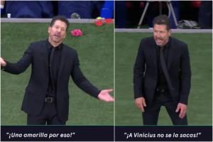 在一次犯規(guī)判罰之后,鏡頭拍到了馬競(jìng)主帥西蒙尼正在對(duì)主裁曼薩諾抗議:“嘿!你在吹什么!冷靜點(diǎn)!就為了這個(gè)出牌?”西蒙尼最后又搖著頭說(shuō):“你不敢對(duì)維尼修斯出牌?!比缓笏侄⒅谒墓賳T重復(fù)了一遍這句話(huà)。