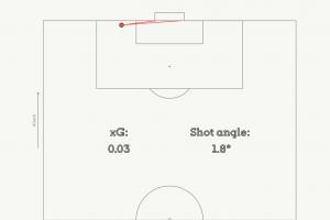 迪亞斯底線極限救球后,絲滑過人,小角度勁射死角。這里進球的預(yù)期進球(xG)僅0.03,射門角度1.8°。