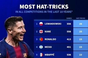 體育資訊11月10日訊 德國轉會市場統(tǒng)計了近10年前十聯賽球員的戴帽次數,并列出榜單。