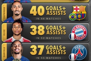體育資訊11月10日訊 Score90統(tǒng)計(jì)了2025年五大聯(lián)賽邊鋒在俱樂(lè)部+國(guó)家隊(duì)比賽中參與進(jìn)球的數(shù)量,并列出榜單。