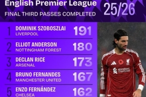 體育資訊11月11日訊 英超聯(lián)賽已經(jīng)進(jìn)行了11輪,squakwa也統(tǒng)計(jì)了本賽季英超進(jìn)攻三區(qū)的成功傳球榜,索博斯洛伊居首。