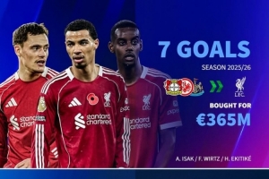 利物浦在今夏共計花費3.65億歐元基礎(chǔ)轉(zhuǎn)會費引進了維爾茨(勒沃庫森)、?;倏耍ǚㄌm克福)、伊薩克(紐卡斯爾),3人至今共計貢獻7球5助攻。