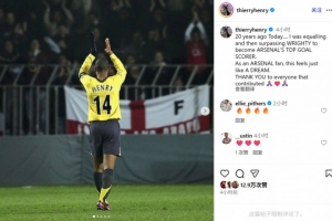 亨利配文寫道:“20年前的今天,我先是追平,此后超越了賴特,成為阿森納隊史第一射手。作為一名槍手球迷,這感覺就像做夢。感謝大家的付出?!?/p>