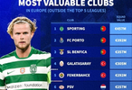 第一:葡萄牙體育/葡超,4.57億歐元。