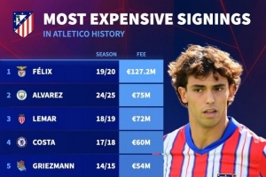 體育資訊11月12日訊 阿波羅體育資本斥資13億歐元收購馬競俱樂部55%股份,并承諾未來幾年再投資約13億歐元,德國轉(zhuǎn)會市場統(tǒng)計(jì)了馬競隊(duì)史引援的費(fèi)用,并列出最貴引援排名。