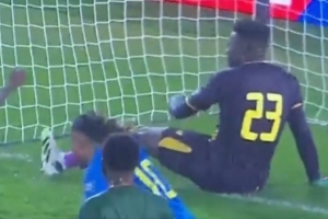 第91分鐘,民主剛果由后衛(wèi)姆貝巴在角球中攻破球門,奧納納伸腳但是沒能擋住皮球打進近角,被進球后癱坐在地↓