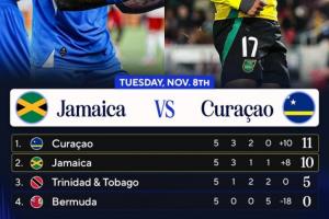 5輪過后,庫拉索11分小組第一,領(lǐng)先小組第二牙買加1分,下輪兩隊將直接交手,庫拉索不敗即直通世界杯,比賽于北京時間11月19日9點在牙買加主場進行。兩隊首回合交手,庫拉索主場2-0擊敗牙買加。