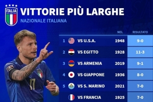 體育資訊11月14日訊 北京時(shí)間11月17日凌晨,意大利將在世預(yù)賽最后一輪比賽中主場(chǎng)對(duì)陣挪威,意大利此役需要至少凈勝挪威9球,才能直接出線。德國轉(zhuǎn)會(huì)市場(chǎng)列出了意大利隊(duì)史最大比分勝利榜單。