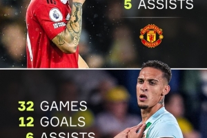 據(jù)統(tǒng)計,安東尼在貝蒂斯生涯32場各項賽事貢獻(xiàn)12球6助攻,直接參與18球,而其在曼聯(lián)生涯96場比賽打進(jìn)12球助攻5次,直接參與17球。