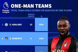 依賴!哈蘭德參與全隊(duì)65%進(jìn)球英超居首,塞梅尼奧53%次席